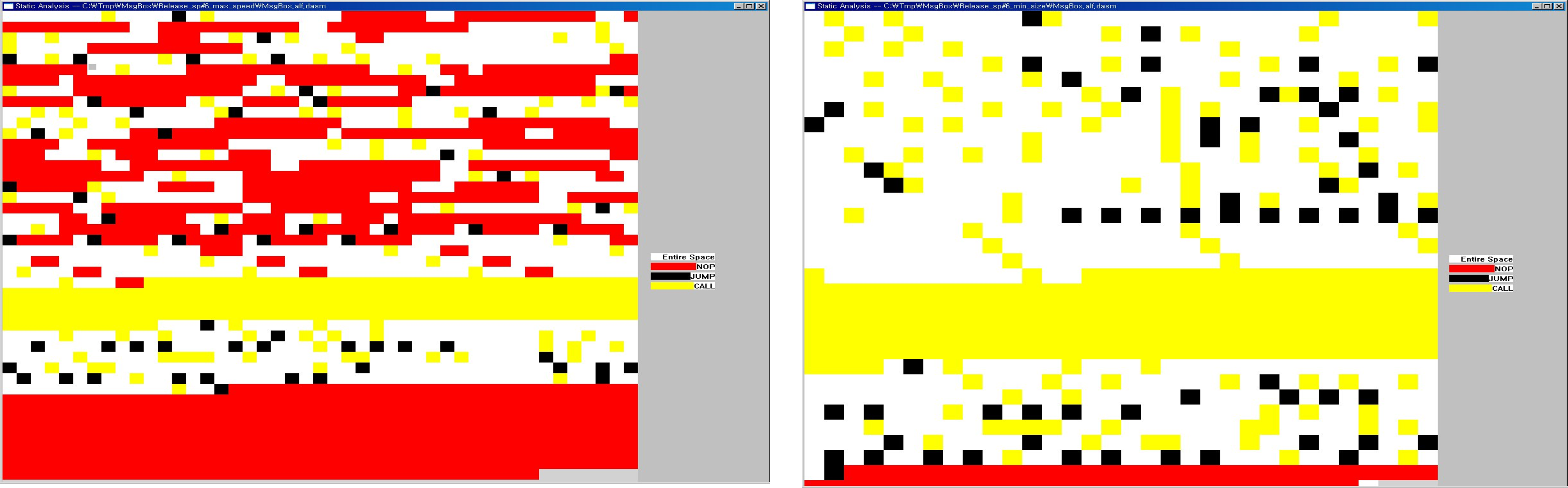 컴파일 옵션에서 속도를 우선으로 최적화하는 경우와 파일크기를 최적화 하는 경우가 있다. 그림에서 빨간색 부분은 NOP이고, 검은색은 JUMP, 노란색은 함수영역이다. 파일크기 최적화시 불필요한 NOP 부분등이 대폭 축소된 것을 확인할 수 있다.